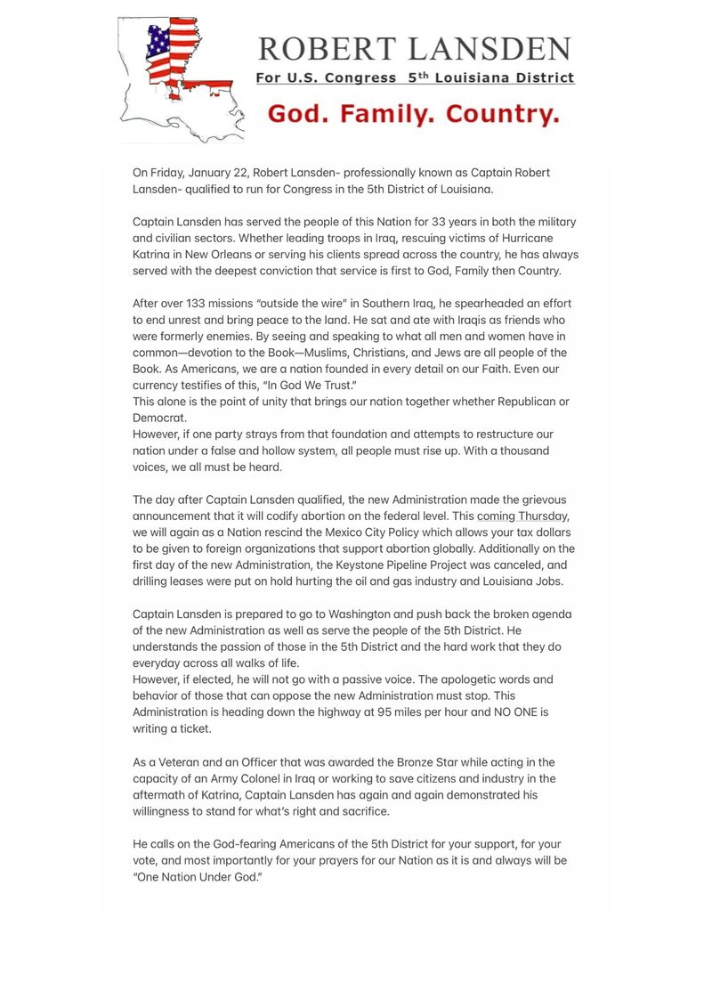 Usually styling himself as “Captain Landsen” since his service in Iraq and during the military occupation of New Orleans after Hurricane Katrina, Robert Landsen (R) practices maritime law in New Orleans and Ponchatoula. He is a devout fundamentalist Christian, hoping to unite people on the grounds that “Muslims, Christians, and Jews are all people of the Book.” Based on Landsen’s campaign materials, his primary political concern is the Biden administration’s willingness to accept that women have a right to abortion and his desire to restrict that right.